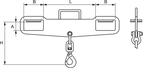 Design: Cut plate with welded support plates. Friction rubber underneath the plates prevents sliding during loading. Model 6702 incorporates large openings for trucks with stabilizer legs. The beam comes complete with shackle and swivel safety hook.